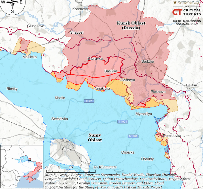 За оцінками Інституту вивчення війни (ISW), російські війська продовжують операції на північ від Сум з метою створення буферних зон уздовж міжнародного кордону, але станом на 7 жовтня майже не просунулися.