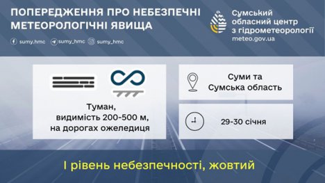 В найближчу годину зі збереженням до кінця доби 29 січня, вночі та вранці 30 січня по Сумській області та м.Суми очікується туман, видимість 200-500 м, на дорогах зберігатиметься ожеледиця (І рівень небезпечності, жовтий).