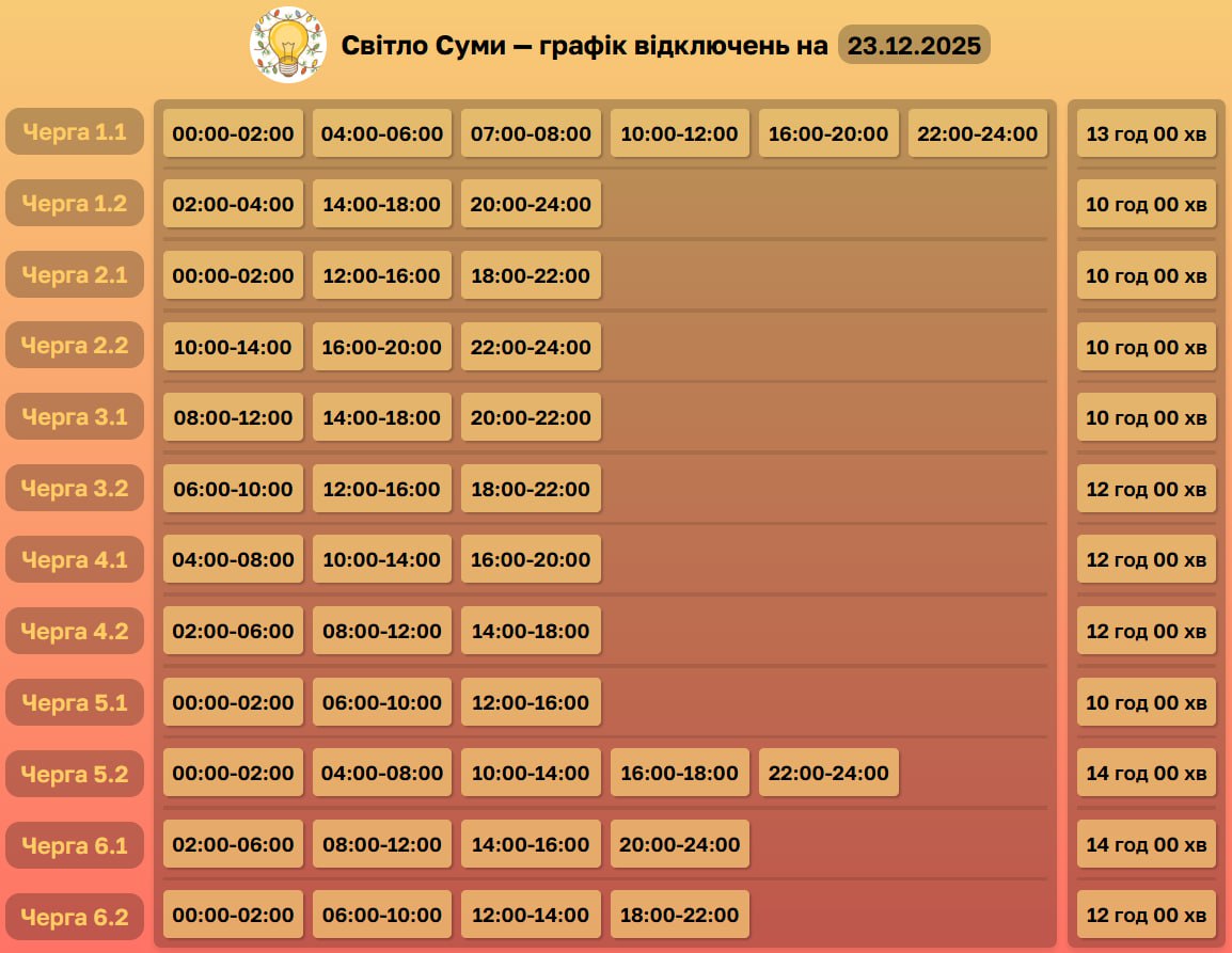 Завтра, 23 грудня, на Сумщині діятимуть графіки погодинних відключень (ГПВ). Відповідні ліміти споживання були доведені до регіону командою НЕК «Укренерго». Єдина причина обмежень — наслідки збройної агресії рф проти української енергосистеми.