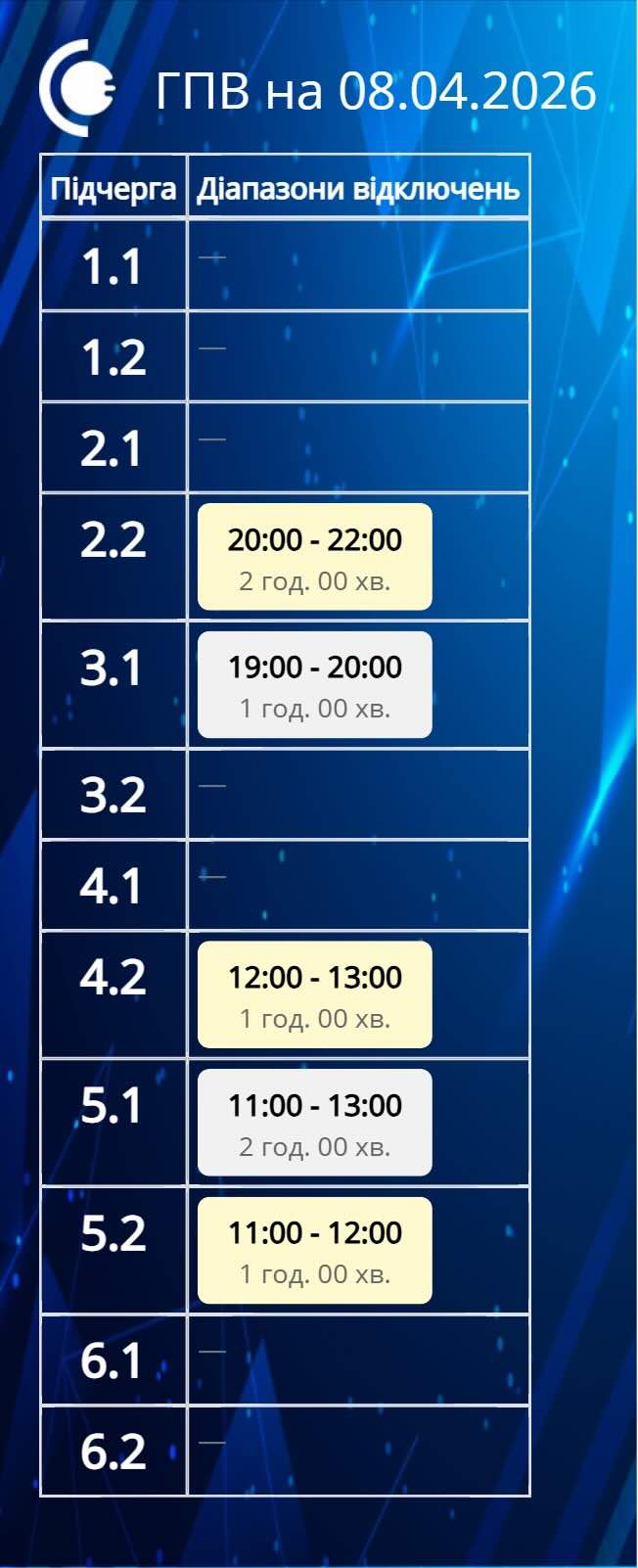 Жителям регіону радять уважно перевіряти актуальний розклад, щоб уникнути незручностей та вчасно підготуватися до вимкнень.