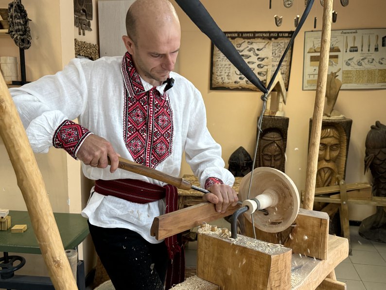 “Матеріал нам проспонсорував музей ткацтва. Далі він трошки підсох, розпиляли бензопилою, знайшли таку товсту дошку – зробили з неї. Потім вона трошки підсохла, рубанком підстругали. Маємо підручник. Ото ніжки. А замість руху, раніше використовували такий довгий хлист. А ногою ми робимо поступальний рух і заготовка обертається. Ну, це така собі фізика, бо чим менший маємо діаметр тут, це називається на бобичці, і більшу заготовку, тим заготовка більше обертається”, – говорить майстер.
