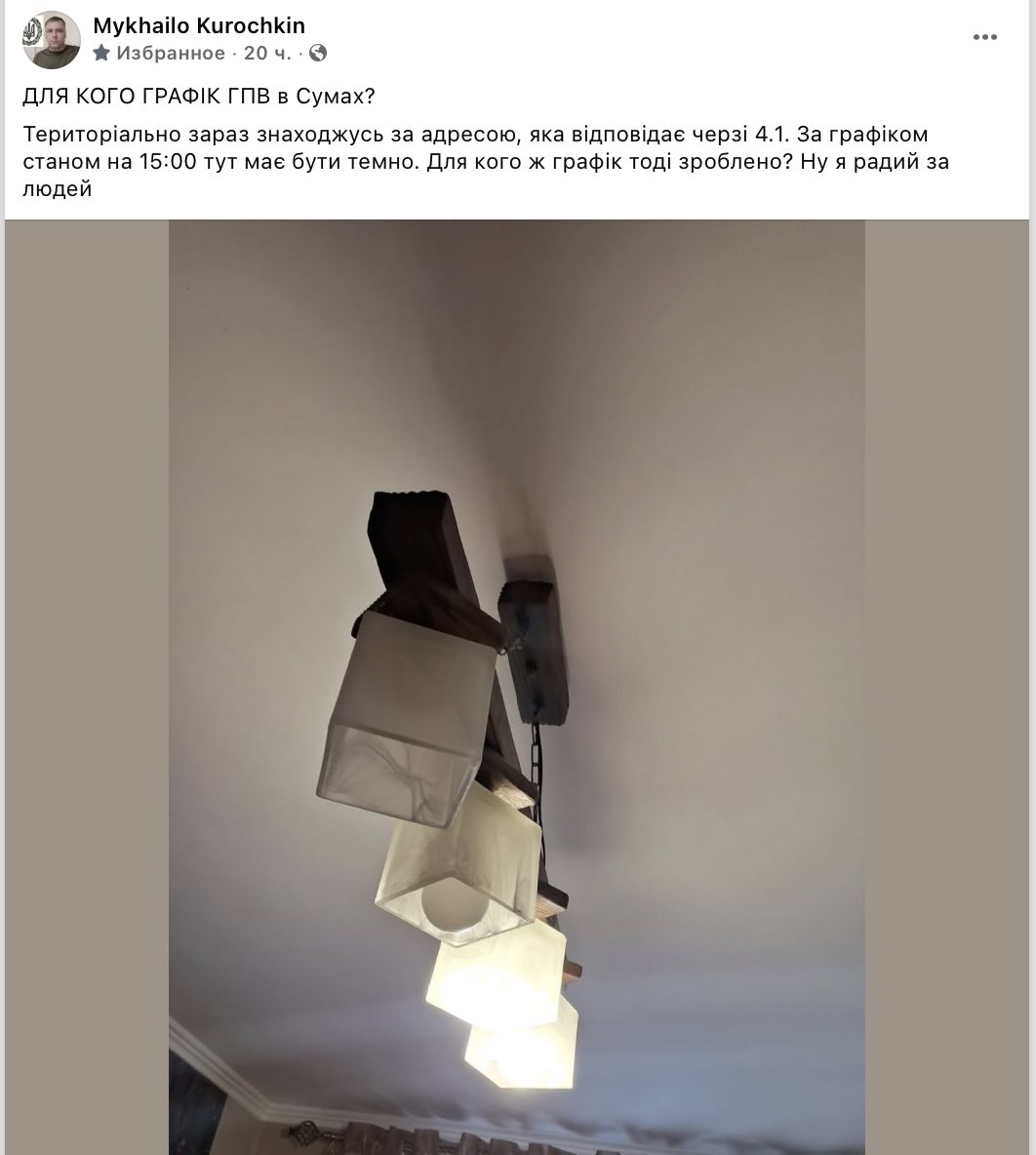 «Територіально зараз знаходжусь за адресою, яка відповідає черзі 4.1. За графіком станом на 15:00 тут має бути темно. Для кого ж графік тоді зроблено? Ну я радий за людей», — написав Курочкін.