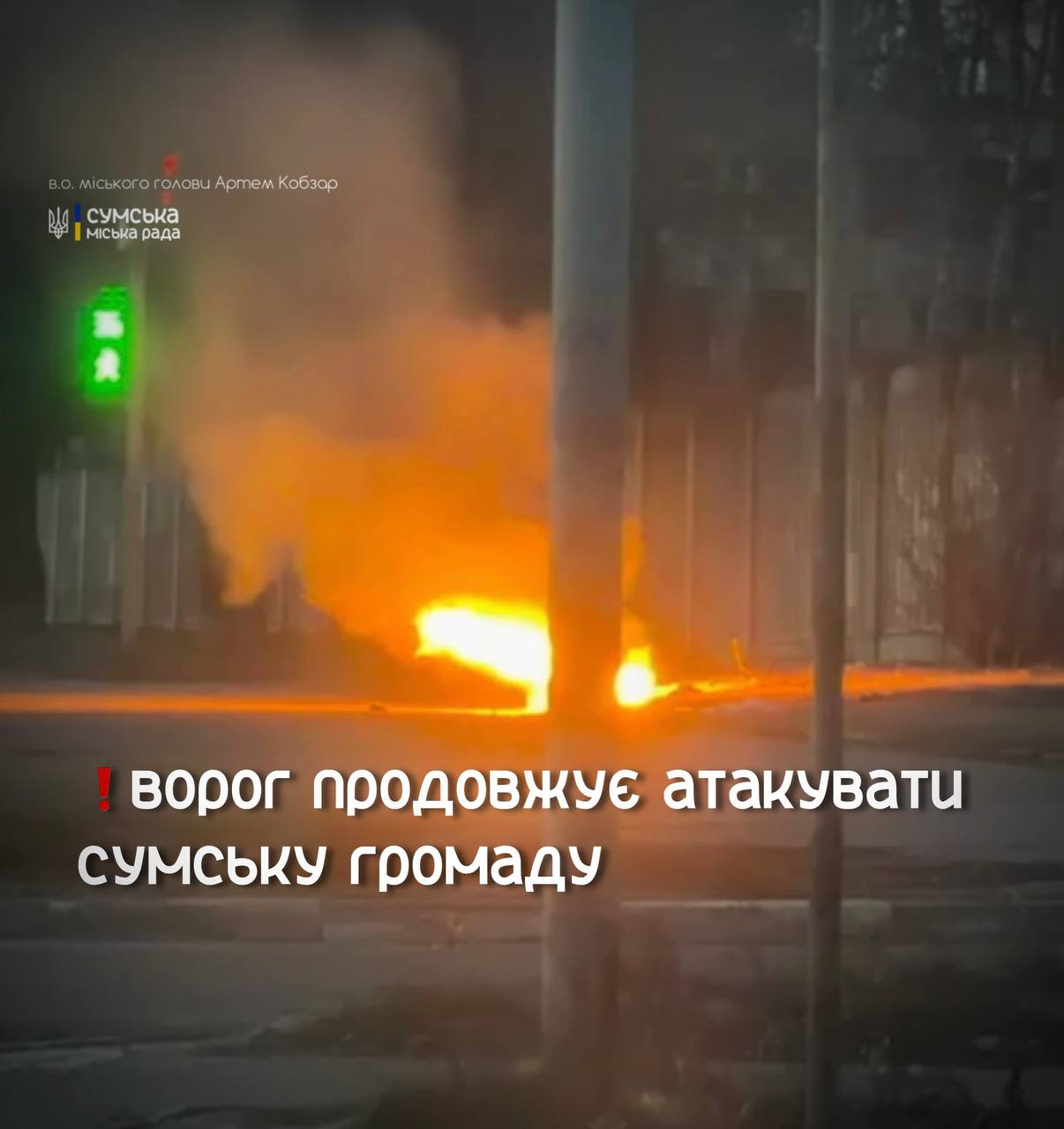 Близько 18:10 у Ковпаківському районі Сум зафіксовано влучання безпілотника «Молнія» — він загорівся на місці.