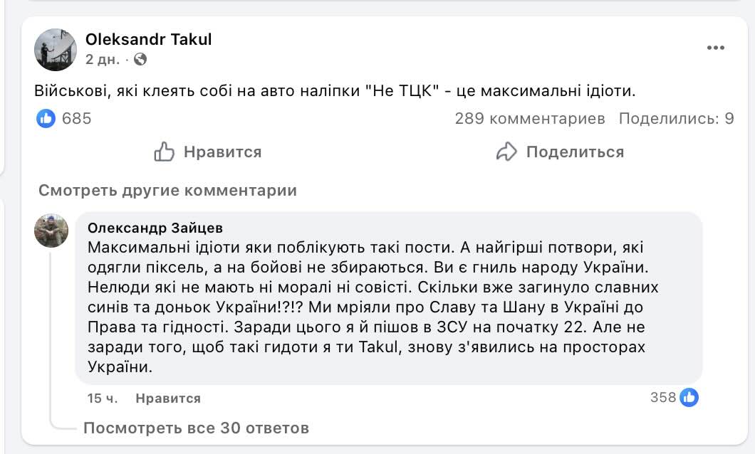 На своїй сторінці у Фейсбуці Такул видав вкрай суперечливий пост, який викликав справедливу хвилю обурення.«Військові, які клеять собі на авто наліпки “Не ТЦК” – це максимальні ідіоти», — безапеляційно заявив медійник.