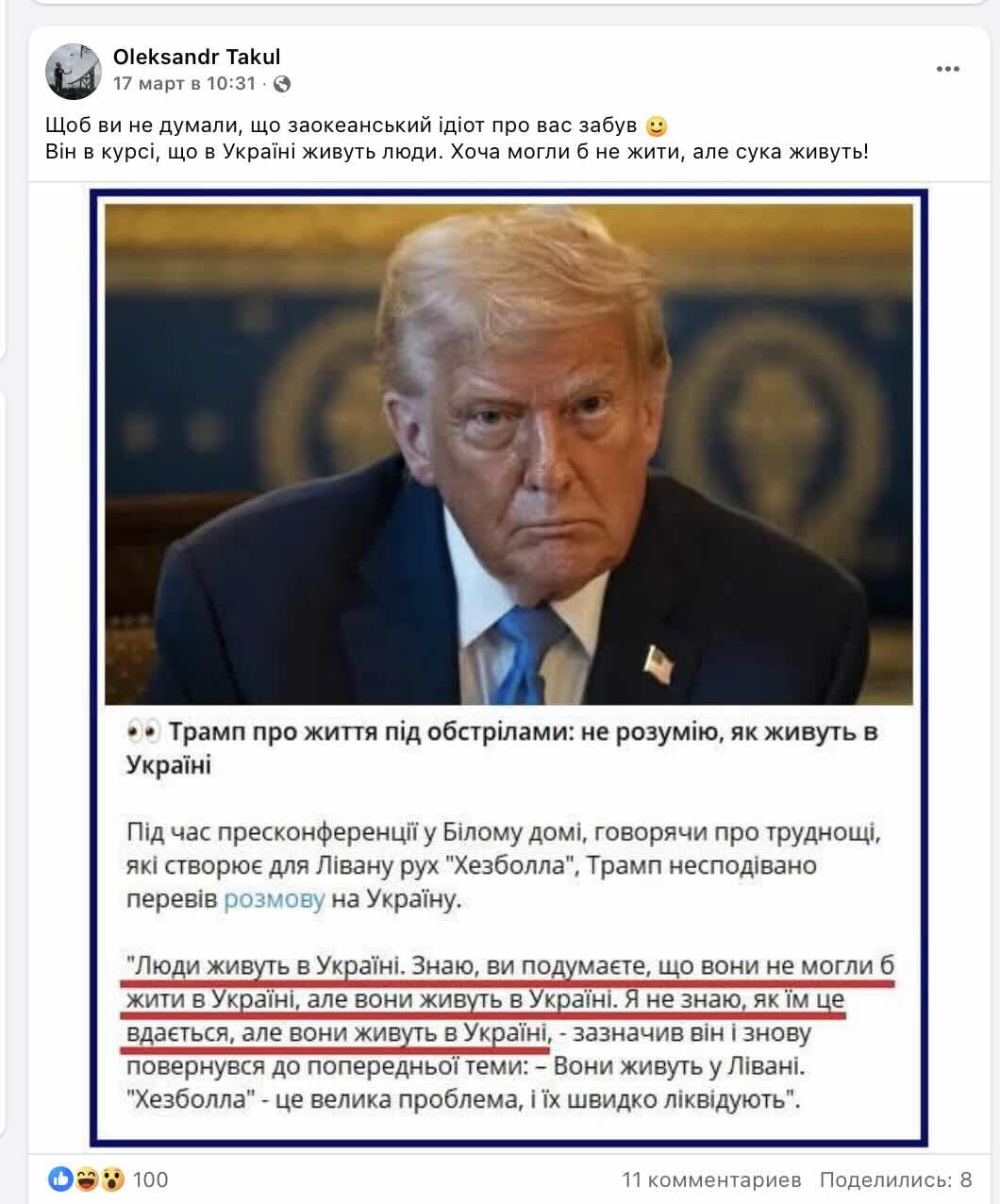 Однак на цьому словесне нетримання екс-керівника сумського телебачення не закінчилося. Нещодавно Такул вирішив спробувати себе в ролі «диванного геополітика» і відзначився абсолютно неприпустимим випадом у бік Президента США Дональда Трампа. Опублікувавши фото американського лідера, він написав: «Щоб ви не думали, що заокеанський ідіот про вас забув. Він в курсі, що в Україні живуть люди. Хоча могли б не жити, але сука живуть!»