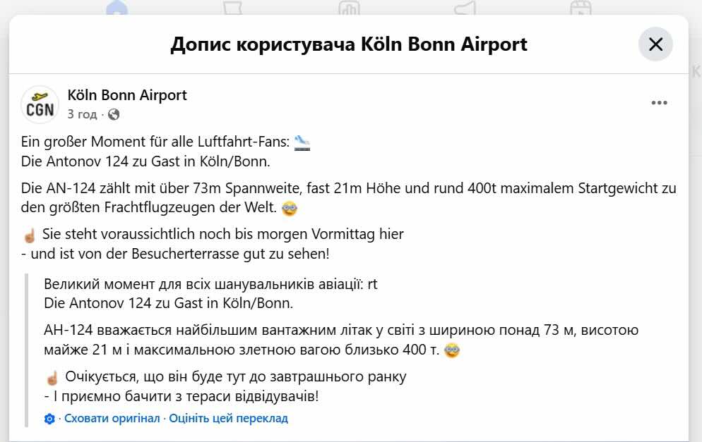 Про приліт українського гіганта повідомили на офіційному ресурсі аеропорту.