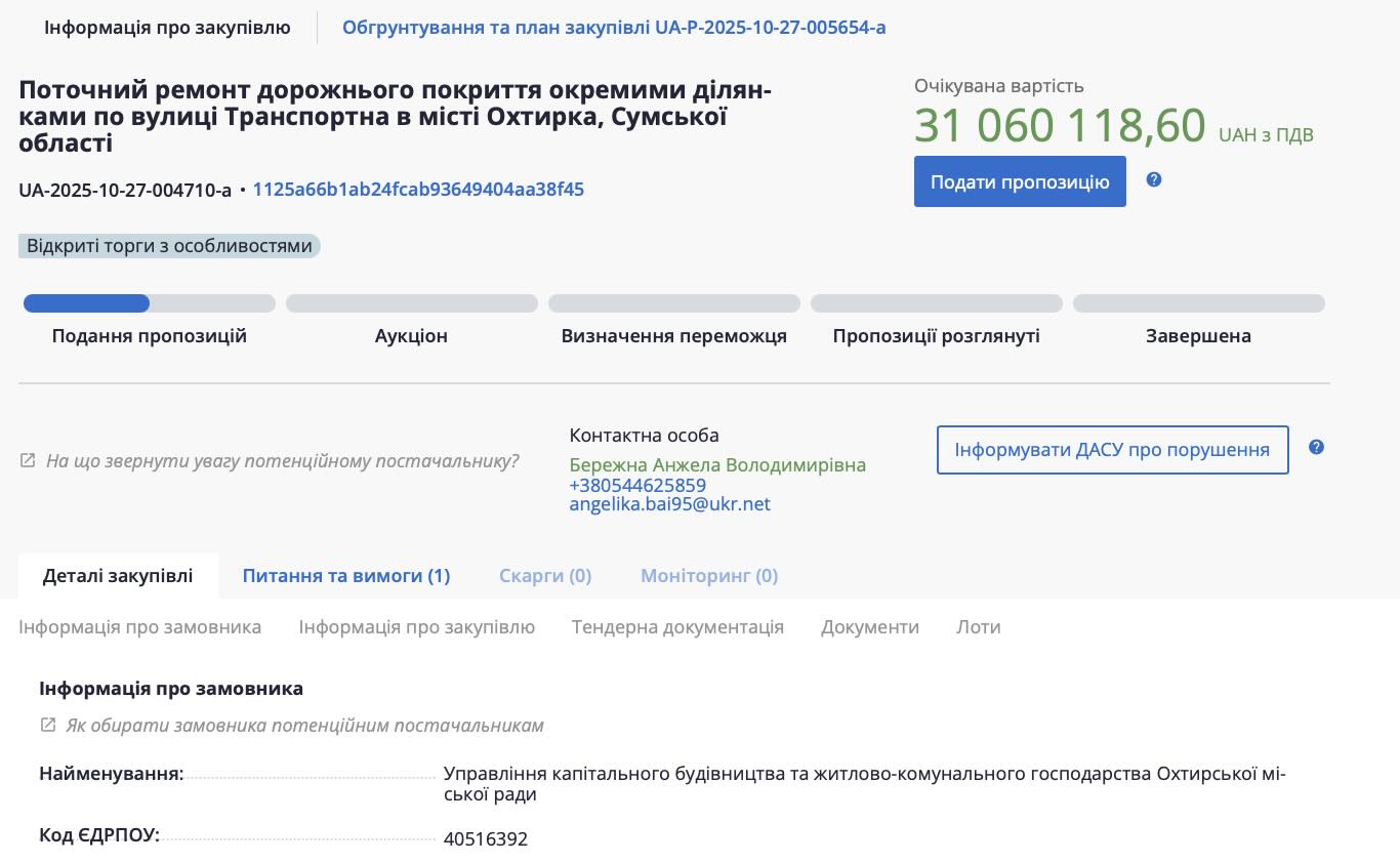 Очікувана вартість робіт — 31 мільйон гривень. Термін виконання — до 31 грудня 2027 року. Подати пропозиції можна до 4 листопада 2025 через Prozorro (ID закупівлі: UA-2025-10-27-004710-a).