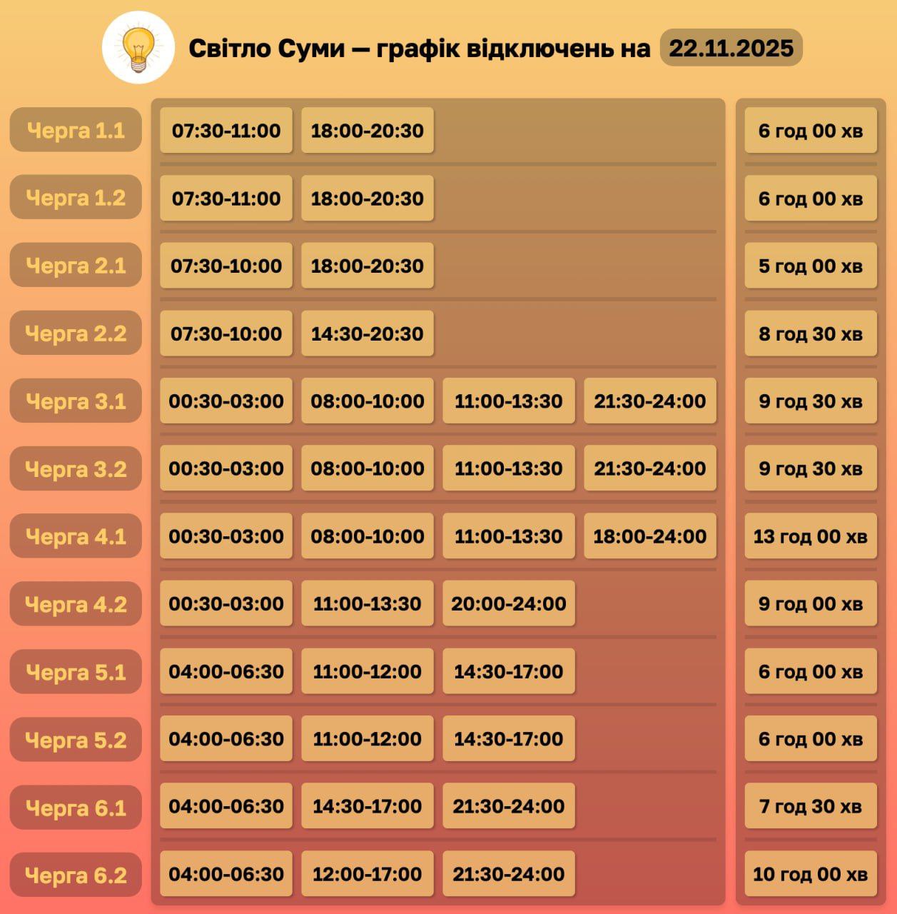 Оновлено графік відключень на 22 листопада 13:19 / 22 листопада 2025 Новини Суспільство Зміни в застосуванні ГПВ на Сумщині, відповідно до команди НЕК “Укренерго” Підписуйтесь на нас у ТЕЛЕГРАМ Підписуйтесь на нас в ІНСТАГРАМ Поділитися в соціальних мережах