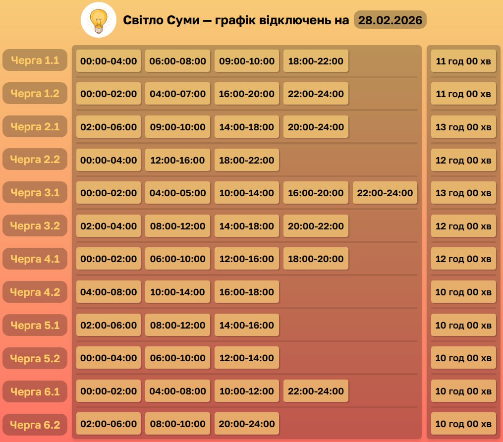 Оновлено графік відключень на 28 лютого 9:56 / 28 лютого 2026 Новини Оновлено графік відключень на 28.02.2026 Зміни: 1.1, 1.2, 3.2, 4.1, 4.2, 5.1, 5.2, 6.1, 6.2 Підписуйтесь на нас у ТЕЛЕГРАМ Підписуйтесь на нас в ІНСТАГРАМ Поділитися в соціальних мережах