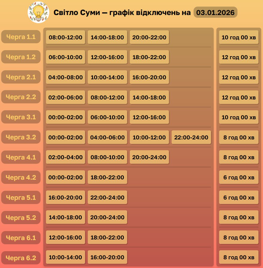 Оновлено графік відключень на 3 січня 13:29 / 03 січня 2026 Новини Командою НЕК “Укренерго” внесено зміни в обсяг застосування графіків погодинних відключень на 3 січня. Зміни для черг: 1.2, 2.1, 2.2, 3.1 Поділитися в соціальних мережах