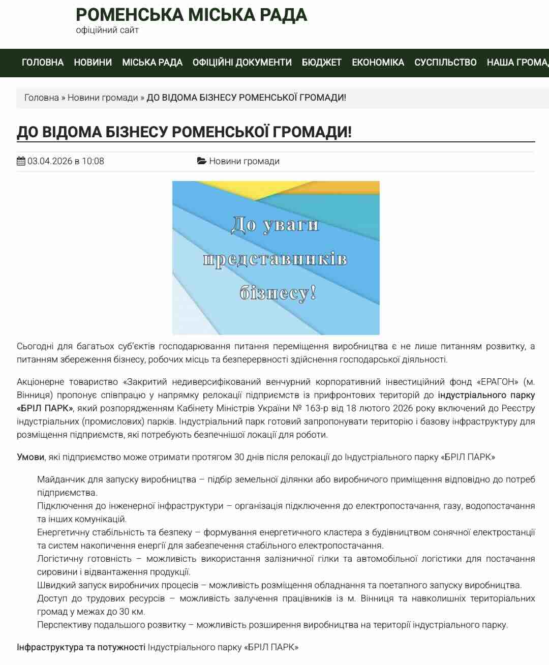 Місцева влада завзято агітує переїжджати до індустріального парку «БРІЛ ПАРК» у Вінниці (проєкт АТ «ЗНВКІФ «ЕРАГОН»). Чиновники так детально розписали переваги втечі з рідних Ромнів, що цьому позаздрить будь-яке рекламне агентство.