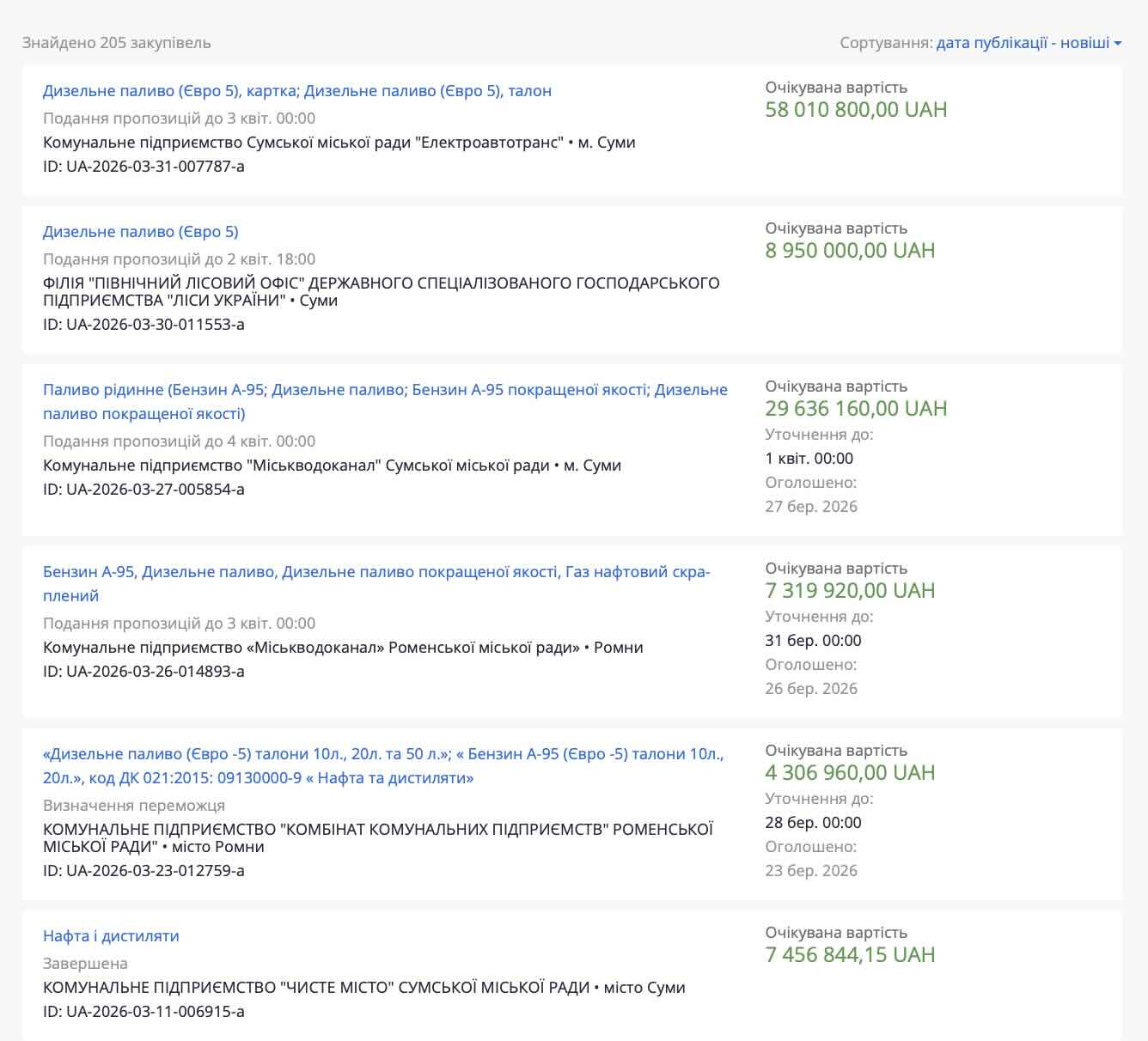 - КП «Комбінат комунальних підприємств» (м. Ромни) — 4,3 млн грн. Підприємство, що відповідає за благоустрій міста, закуповує 52 000 літрів дизелю та бензину в талонах із терміном постачання до кінця червня 2026 року.