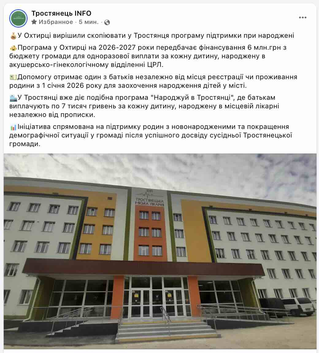 У Тростянці, схоже, вважають, що винайшли не лише шоколад, а й соціальну допомогу. Рупор місцевої мерії — видання «Тростянець INFO» — вибухнуло гнівним дописом у бік сусідньої Охтирки. Причина «скандалу» гідна анекдоту: сусіди, бачте, нахабно «скопіювали» ініціативу підтримки породілей.