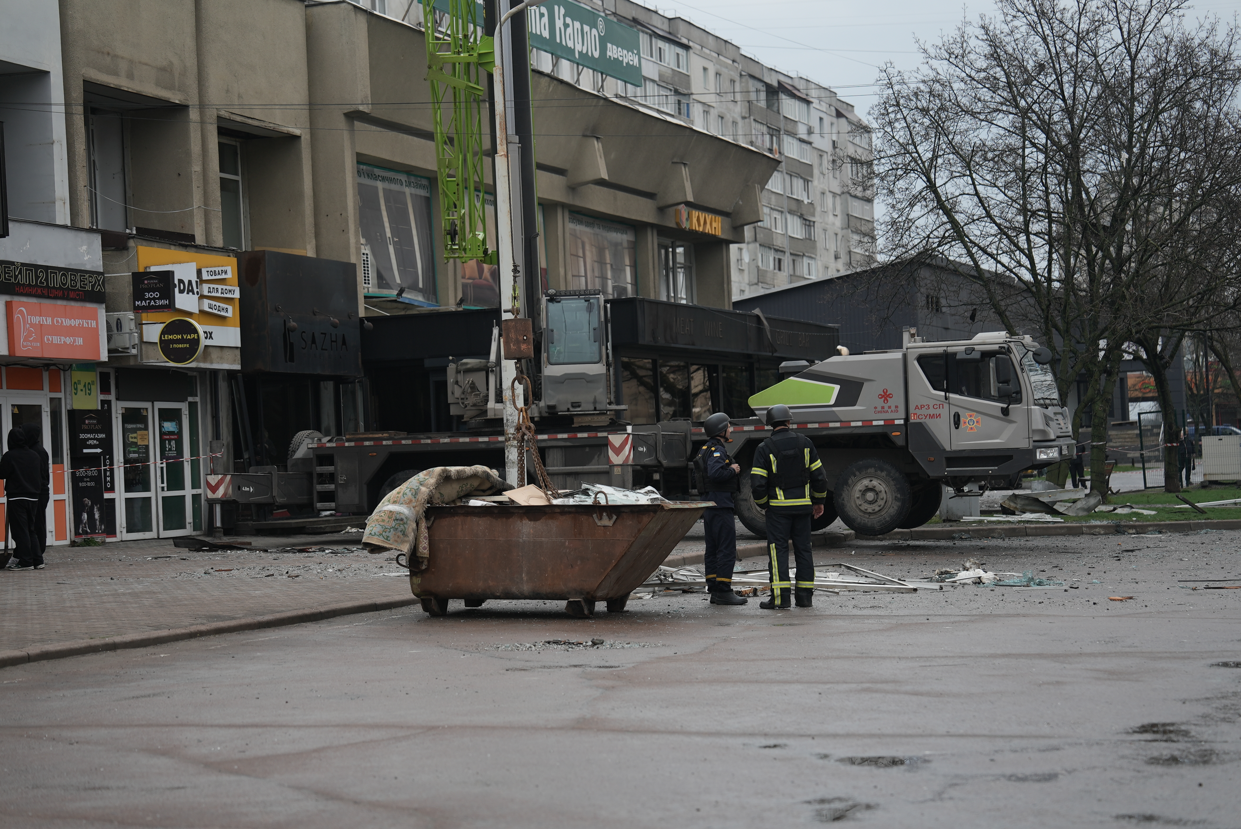 “Ми з ночі прибігли сюди, тому що бачили, що був удар. Нам повідомили: той бік повністю горіло. Слава Богу, в магазині не горіло. Тут вся стеля обвалилася, кондиціонери, скло вибите, пошкоджень багато, дуже багато, слава Богу, обладнання ціле, люди цілі”, — розповіла керуюча магазином Ірина Остапенко.