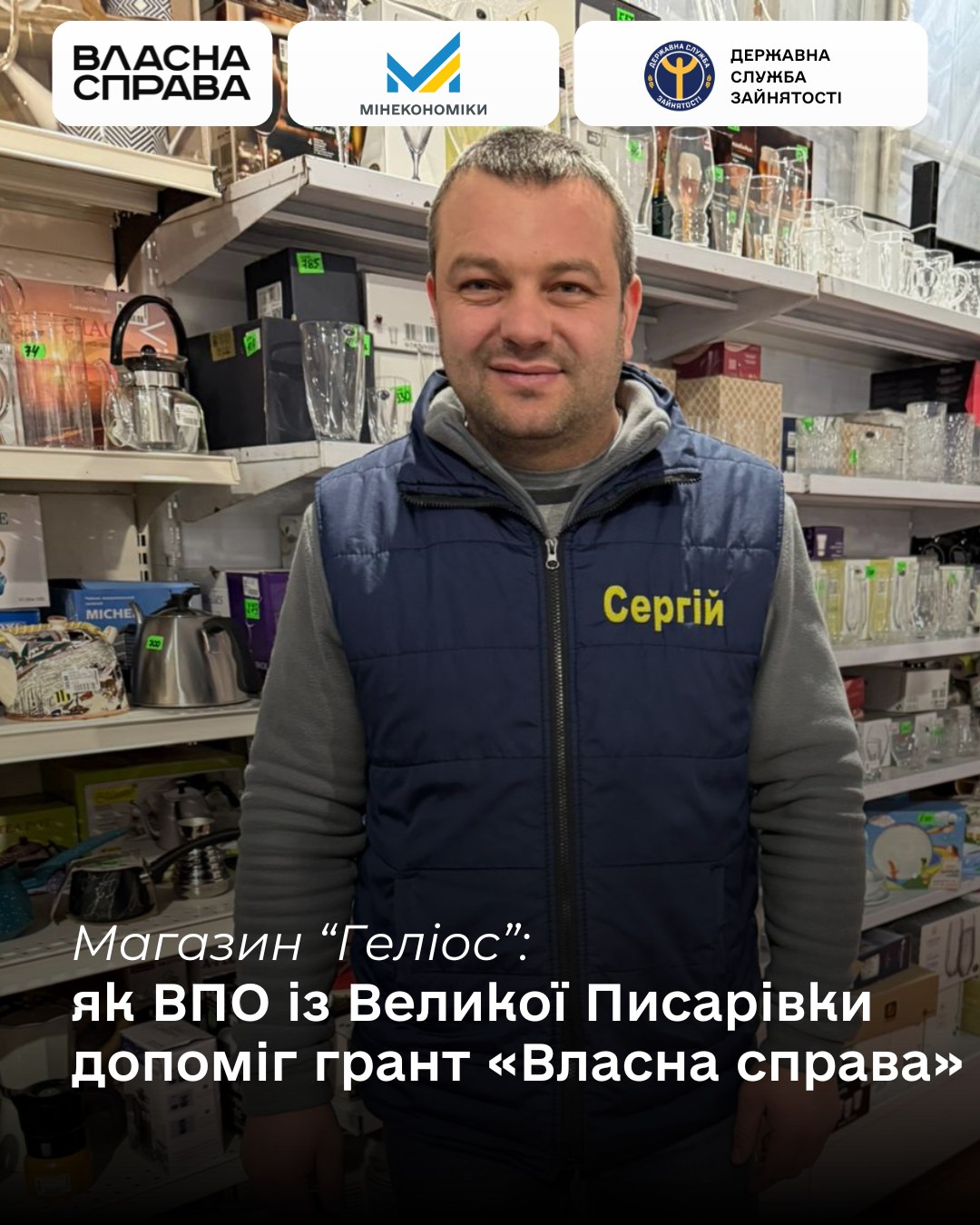 Про грантову програму “Власна справа” чоловік дізнався із соціальних мереж. Після подання заявки він отримав грант у розмірі 250 тисяч гривень, які спрямував на придбання торговельних стелажів. Відповідно до умов програми підприємець створив два робочі місця, зокрема для внутрішньо переміщеної особи з Великої Писарівки.
