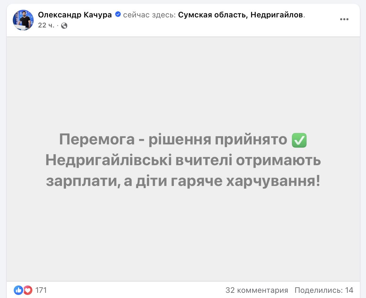 Качура підкреслив: «Вчителі не повинні перетворюватися на прохачів, коли йдеться про їхню законну зарплату. Працювати для дітей — гідно та чесно, а не в очікуванні допомоги».