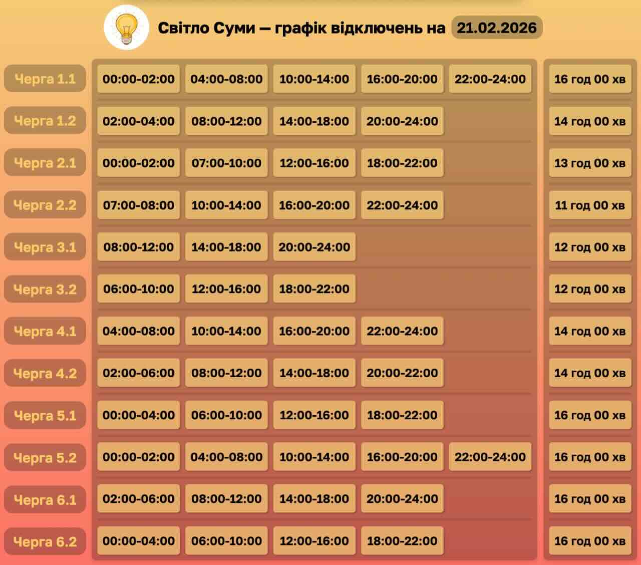 Справжнє випробування темрявою чекає на жителів Сумщини вже завтра, 21 лютого. За вказівкою «Укренерго» в області запроваджують жорсткі графіки погодинних відключень, які залишать людей без електроенергії на виснажливі 12, а то й 16 годин.
