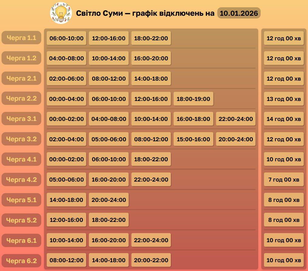 У суботу, 10 січня, на Сумщині діятимуть графіки погодинних відключень електроенергії. Обмеження застосовуватимуться відповідно до обсягів, доведених командою НЕК «Укренерго».