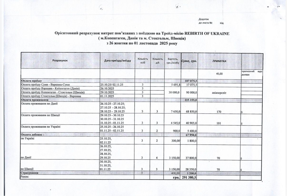 На скандинавське “турне” Артема Кобзаря (з яким ще їдуть два депутати ОПЗЖ, серед яких відомий в Сумах бізнесмен Віталій Жиленко). Витратять 291 380 гривень.