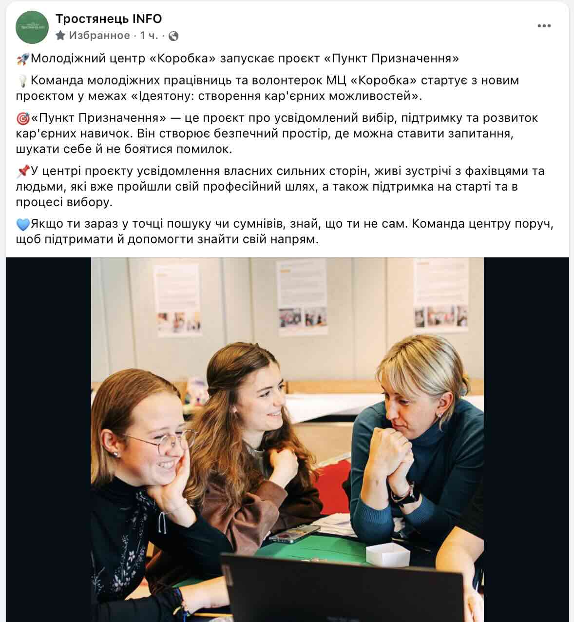 Офіційне видання міськради «Тростянець INFO» пафосно звітує: «Молодіжний центр «Коробка» запускає проєкт «Пункт Призначення». Серйозно? «Пункт Призначення»?