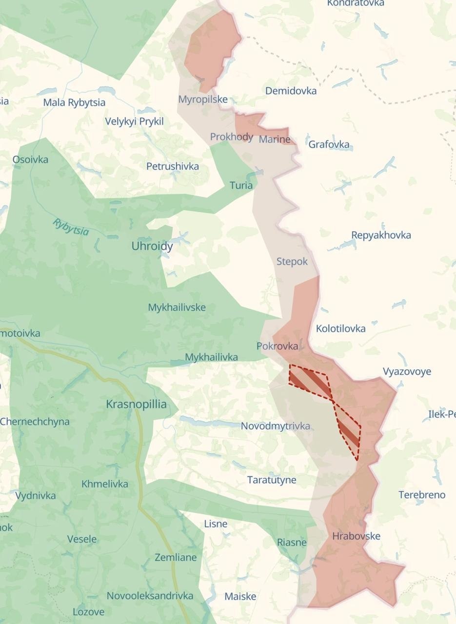 Ще один напрямок — район Мар’їного та Новодмитрівки на південному сході області, поблизу кордону з РФ. Новодмитрівка і сусідня Покровка, де раніше вже фіксували розширення зони контролю, розташовані у напрямку Краснопілля. Від лінії фронту до цього населеного пункту нині менше ніж сім кілометрів.