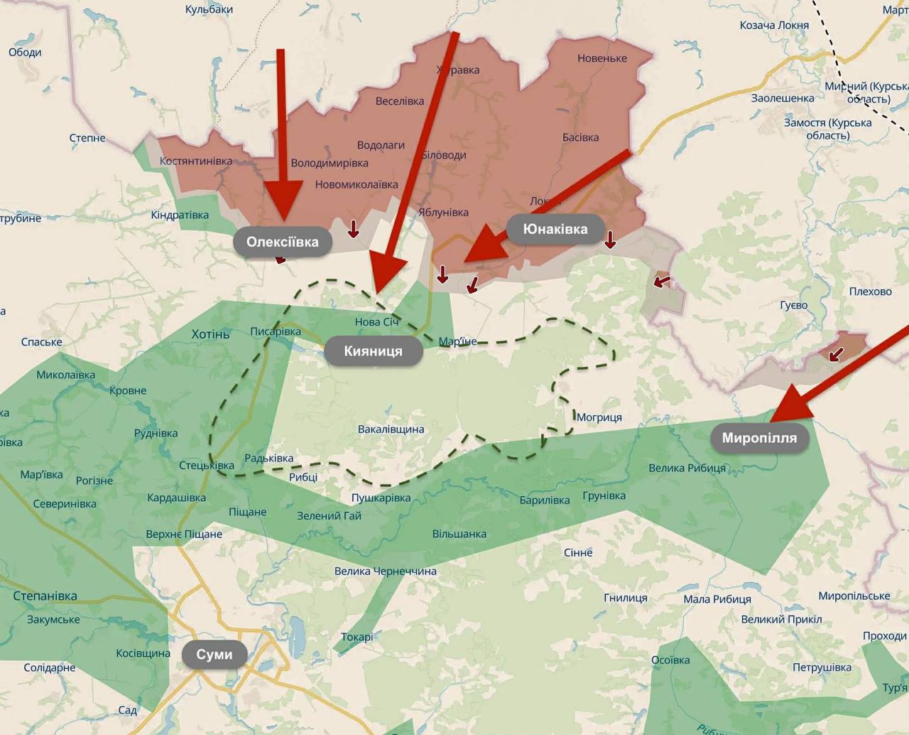 Основним напрямком наступу залишається захоплена росіянами ділянка між селами Олексіївка-Яблунівка-Юнаківка. З цього боку росіяни мають одразу три “гілки”, вздовж яких тягнуться до сіл Хотінь, Писарівка, Нова Січ.