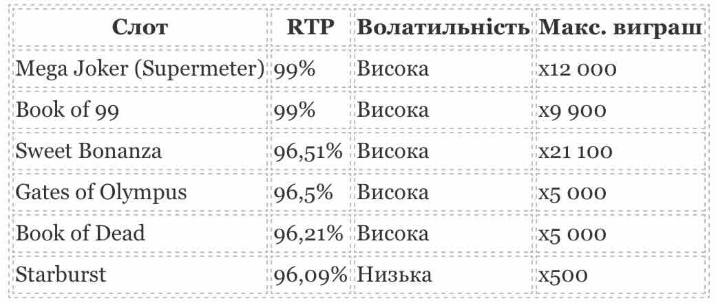 Найкращий слот із високим RTP 99% — це Mega Joker від NetEnt. Ugga Bugga від Playtech має коефіцієнт виплат 99,07% і низьку волатильність. Book of 99 від Relax Gaming також має RTP 99%.
