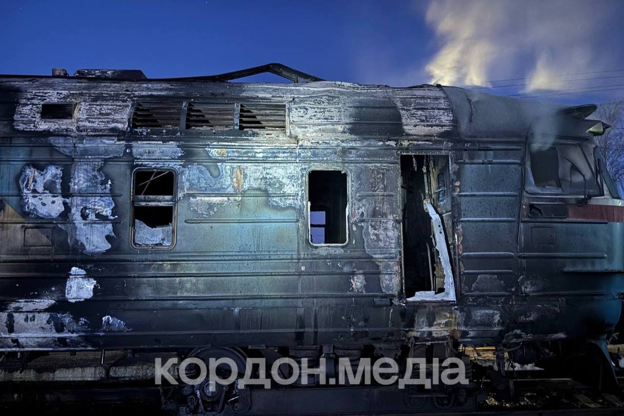 Вагон тепловоза через влучання російського БпЛА майже повністю вигорів. Рятувальники вже загасили пожежу, — дізналися воєнкори Кордон.Медіа на місці події.