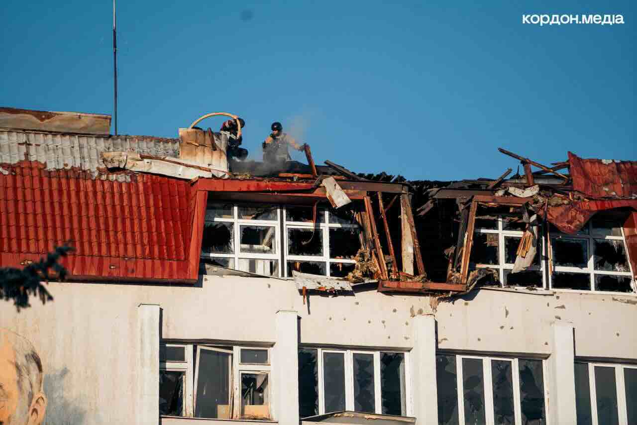 Згодом два безпілотники влучили у будівлю державної установи. Спочатку удар прийшовся по одному з кабінетів — із приміщення евакуювали близько 50 людей. Після цього ще один дрон поцілив у дах — у будівлі знову спалахнула пожежа.