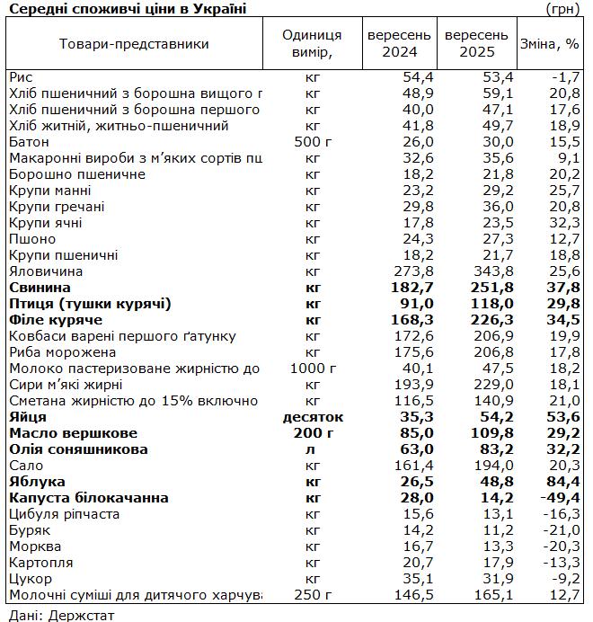 Деякі овочі — навпаки, подешевшали: капуста впала майже наполовину (-49,4%), буряк — на 21%, морква — на 20%, цибуля — на 16%, картопля — на 13%.