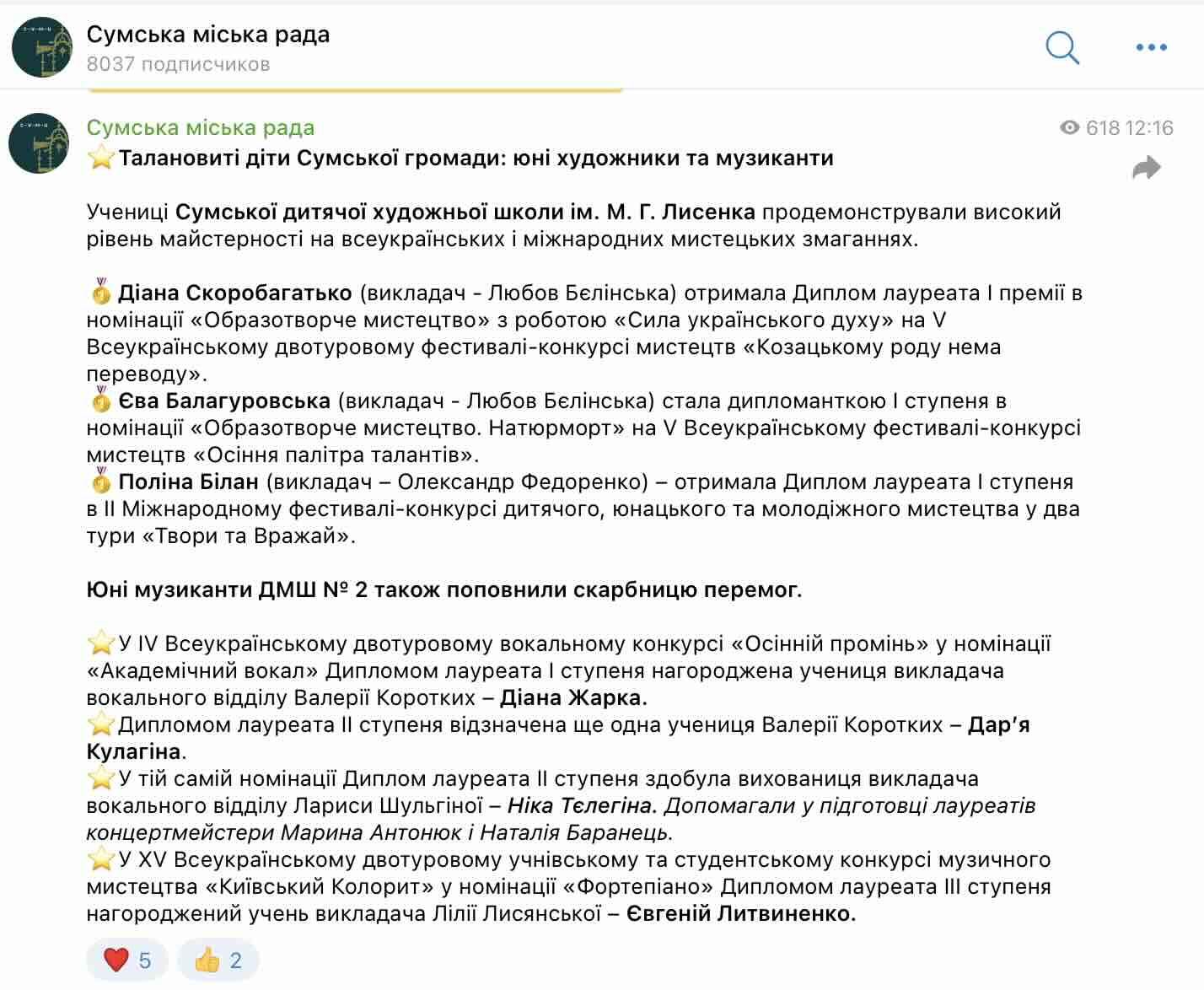 Сумська міська рада радісно звітує: наші юні художники та музиканти знову прославили громаду на всеукраїнських і міжнародних конкурсах. Дипломи, лауреати, перемоги — повний набір. Здавалось би, справжній тріумф освіти та мистецтва. Але є одне «але» — і воно пахне грошима сильніше, ніж нові фарби у художній школі.