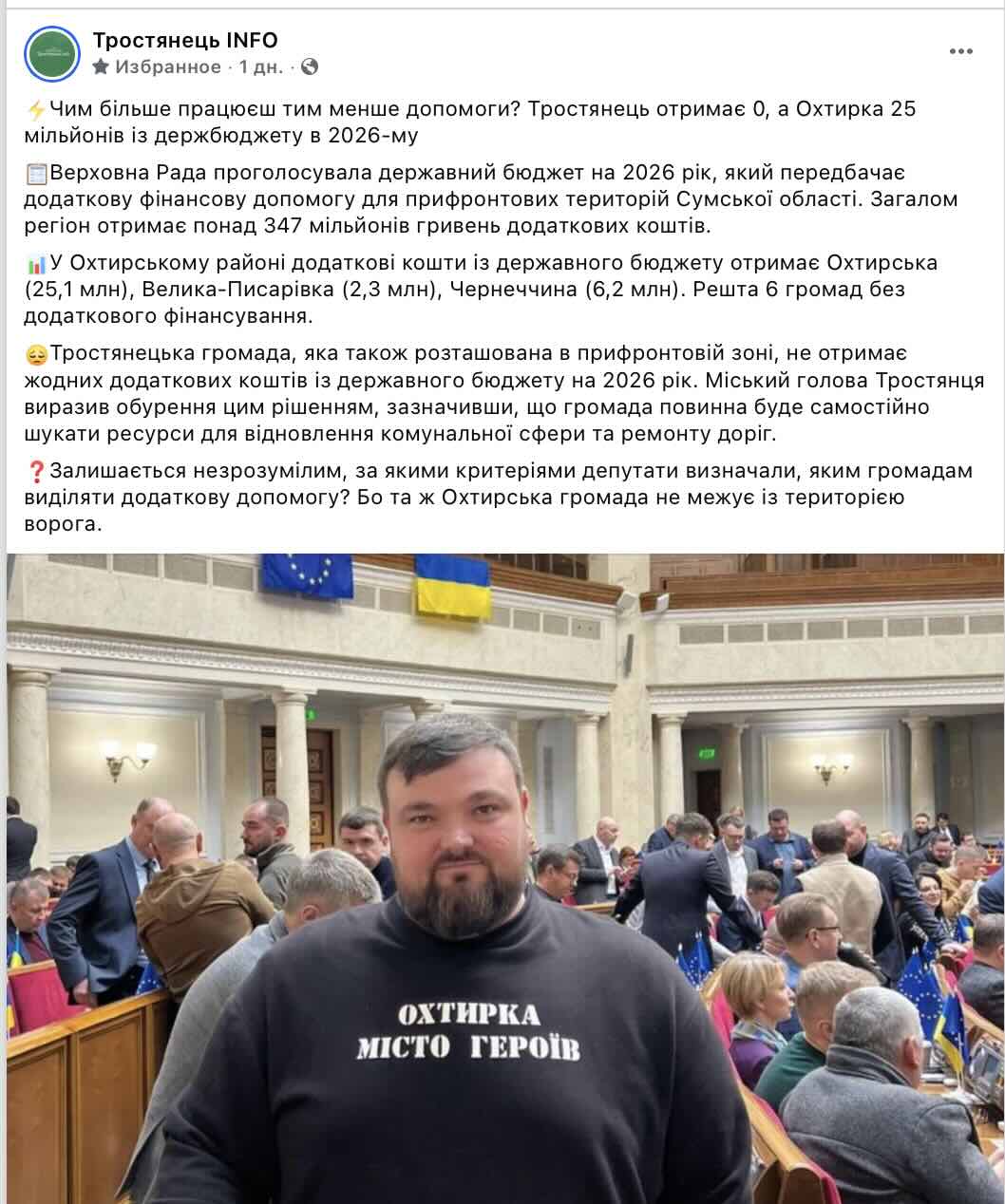 На офіційних ресурсах Тростянецької міської ради днями з’явився допис, просякнутий болем і несправедливістю. Мовляв, Верховна Рада «кинула» шоколадну столицю, не виділивши додаткових субвенцій на 2026 рік, тоді як сусідам з Охтирки перепало трохи фінансування.
