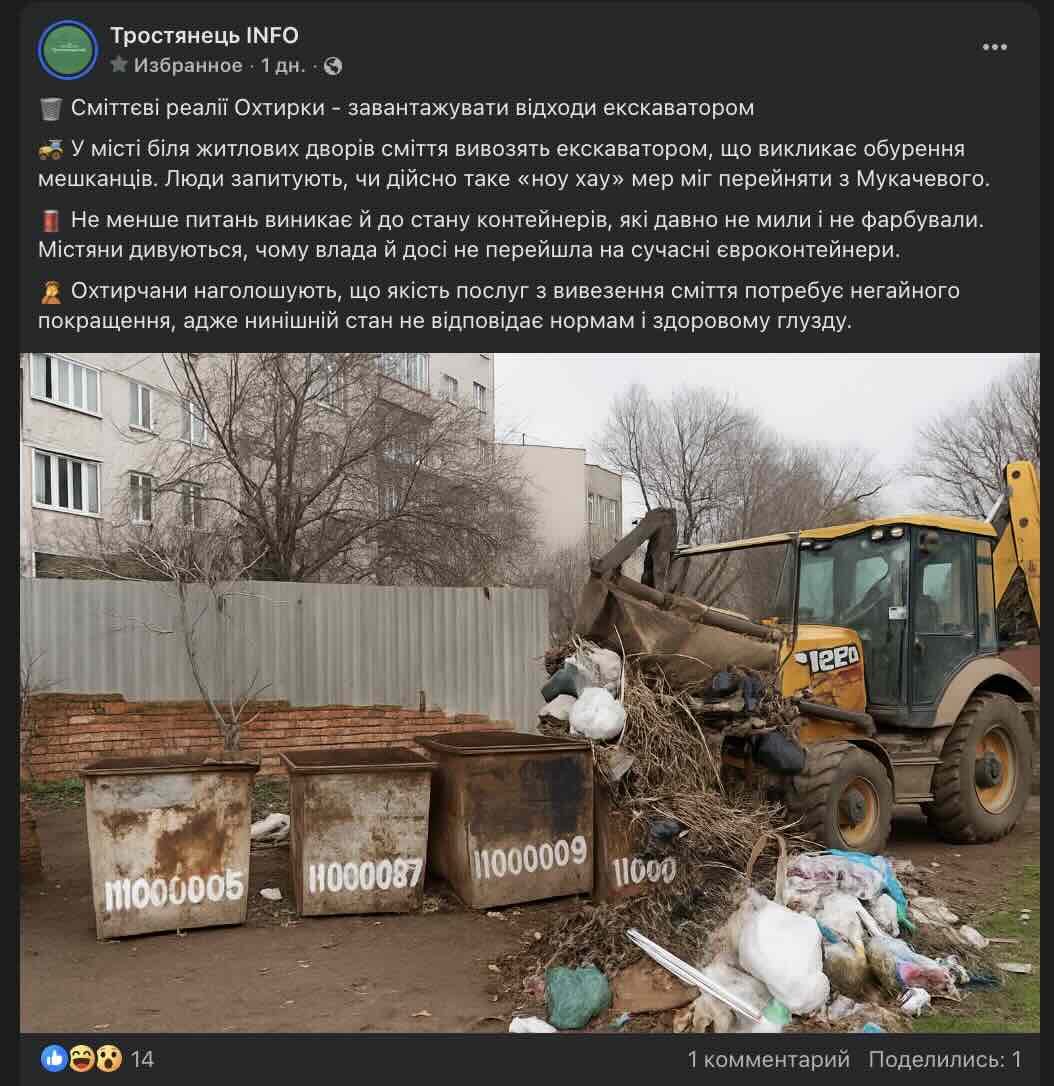 Тростянецькі журналісти (чи то пак піарники Бови) з непідробним подивом описують «сміттєві реалії Охтирки». Головний хіт сезону — завантаження побутових відходів важкою будівельною технікою.
