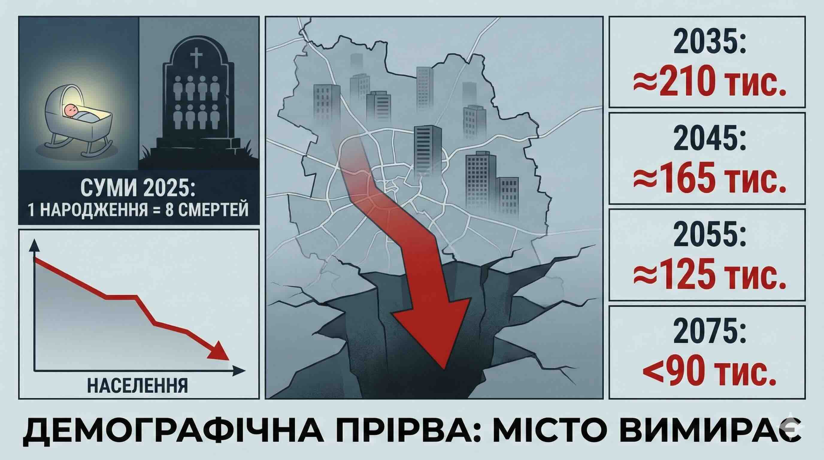 - Прогноз: Лише за рахунок природного скорочення (смертність мінус народжуваність) місто втратить близько 48 тисяч людей. Додайте сюди міграцію молоді. Суми втратять чверть своїх мешканців. Дев’яті класи в школах будуть напівпорожніми.
