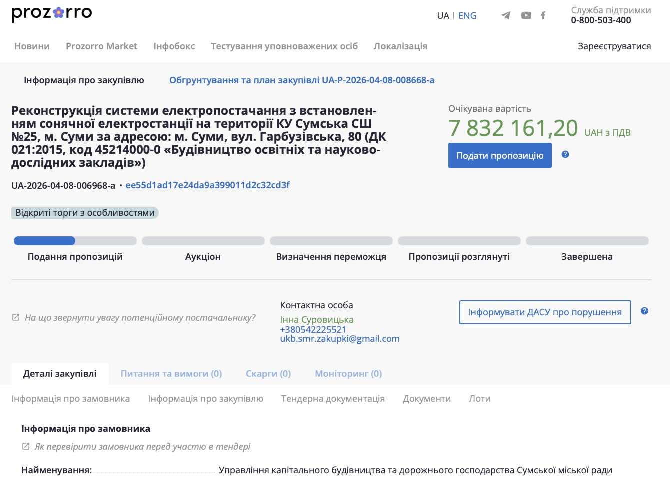 Пошук підрядника вже стартував: прийом пропозицій триватиме до 9:00 23 квітня 2026 року, а сам аукціон відбудеться 24 квітня.