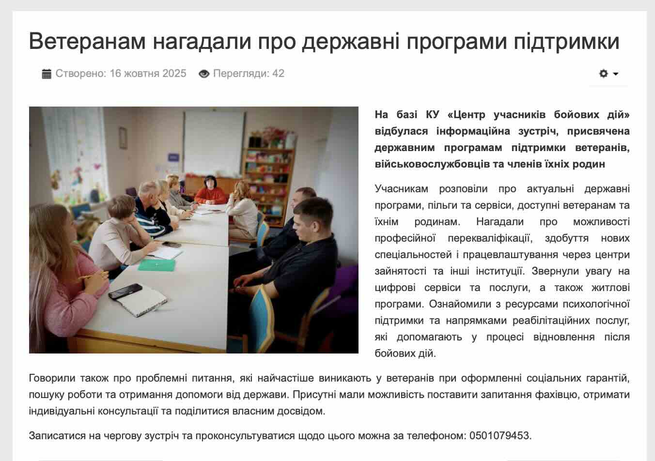 Сайт Сумської міської ради радісно повідомляє: у Центрі учасників бойових дій відбулася грандіозна інформаційна зустріч для ветеранів та їхніх родин. Там їм розповіли про пільги, державні програми, перекваліфікацію, житло і навіть психологічну підтримку. Усе серйозно, усе важливо!