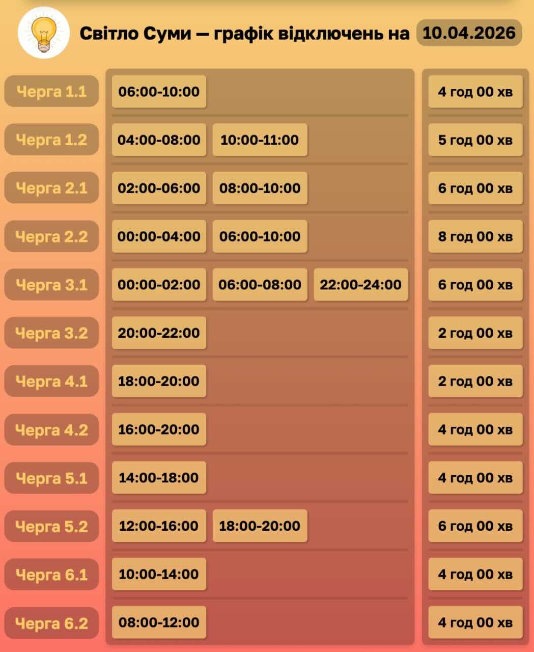 Для жителів Сумської області оновили графік відключень електроенергії на 10 квітня 2026 року.