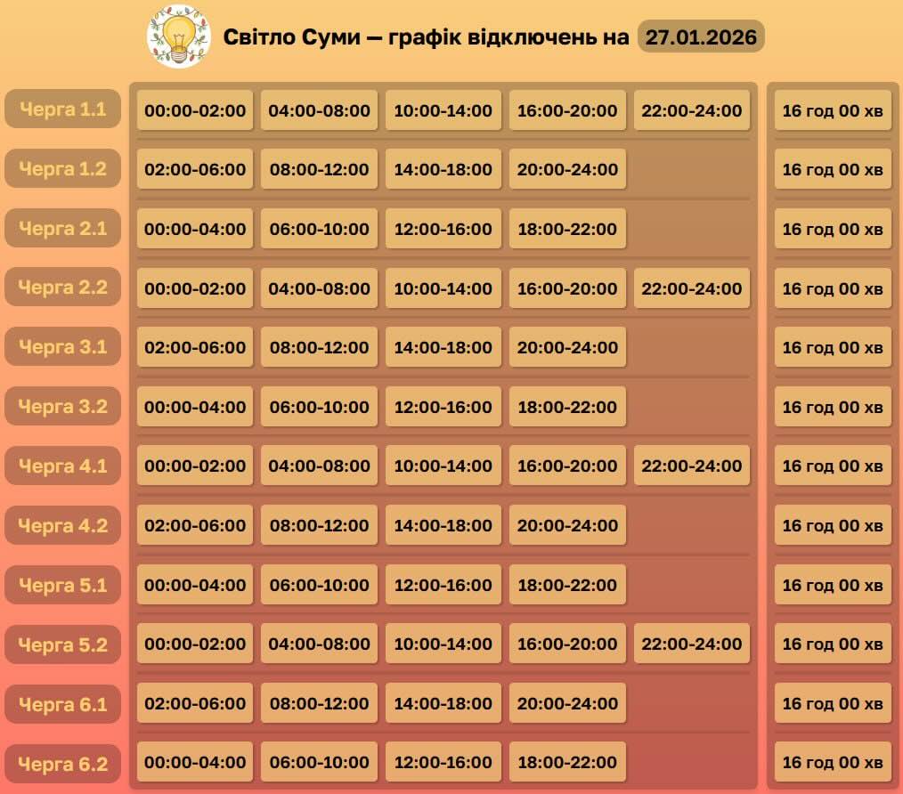Світло за графіком: 27 січня на Сумщині світло вимикатимуть по 16 годин