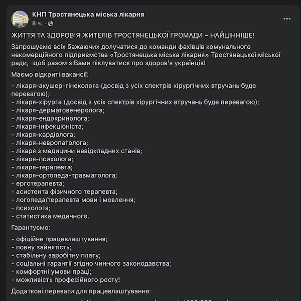 Поки на офіційних сторінках лунають пафосні гасла про те, що “життя та здоров’я — найцінніше”, реальний стан справ у Тростянецькій міській лікарні нагадує сценарій фільму-катастрофи. Адміністрація закладу опублікувала оголошення про вакансії, яке більше схоже на крик відчаю, ніж на плановий набір персоналу. Судячи зі списку, лікарня фактично залишилася без ключових спеціалістів.