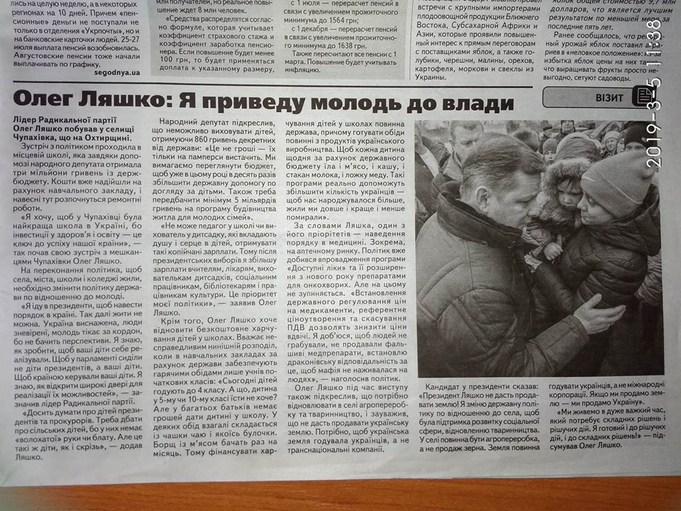 11 лютого Олег Ляшко побував у місті Охтирка та селищі Чупахівка, де провів зустрічі з виборцями. Візит політика активно висвітлювали регіональні ЗМІ. Частина публікацій не містить відповідних позначок і має ознаки “джинси”.