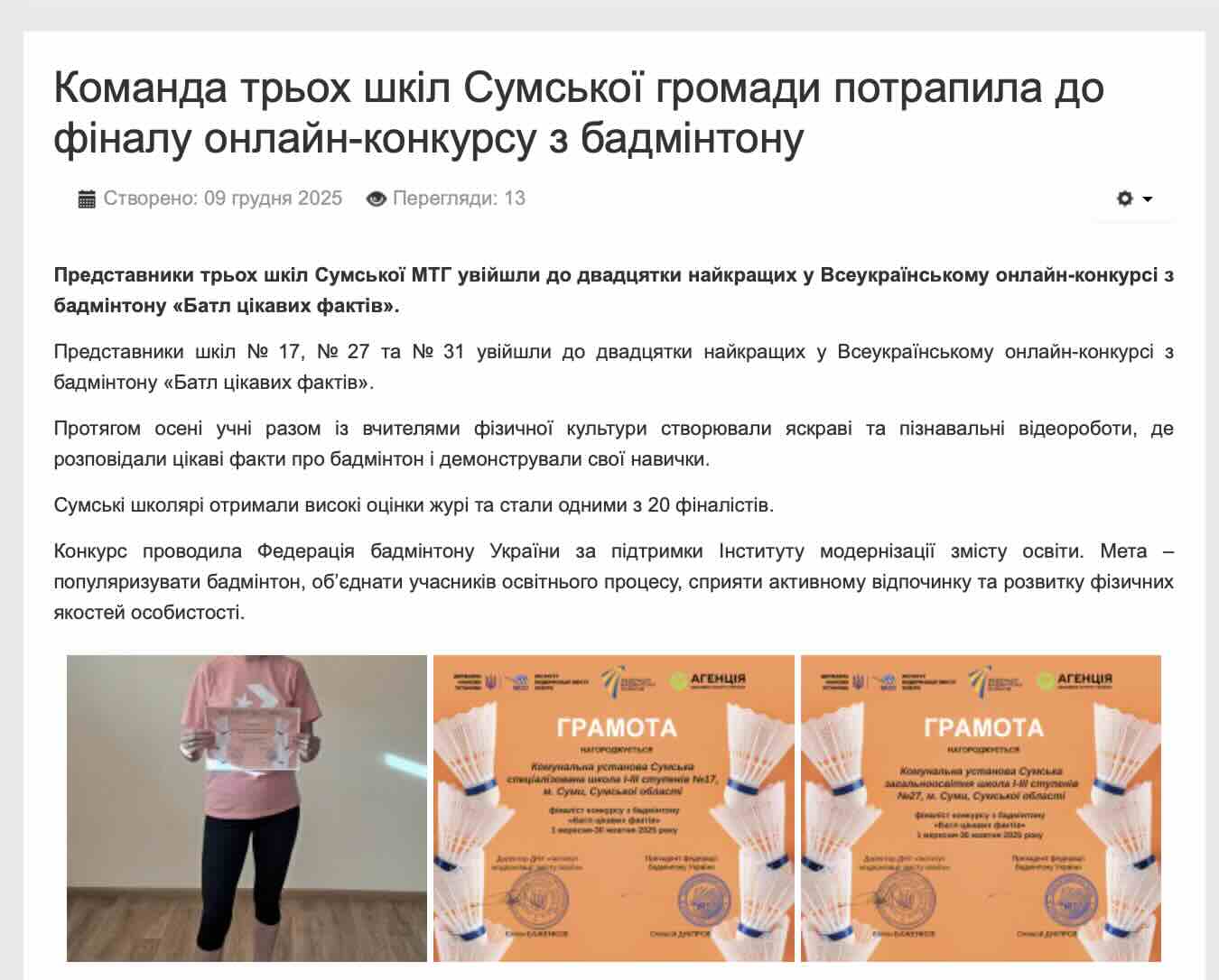 Сумська міська рада урочисто звітує про грандіозний успіх: наші школярі стали фіналістами конкурсу з бадмінтону. Але не поспішайте уявляти напружені сети, піт та стерті кросівки. Виявляється, у сучасних суворих реаліях перемагає не той, хто влучно б’є ракеткою, а той, хто вміє… красиво про це розказати.