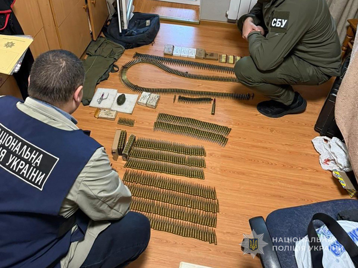 Під час санкціонованого обшуку поліцейські вилучили корпус ручної гранати типу Ф-1 із запалом, а також понад п’ятсот набоїв калібру 7,62 мм, які, згідно з висновками експертів, є бойовими припасами та придатні до використання.