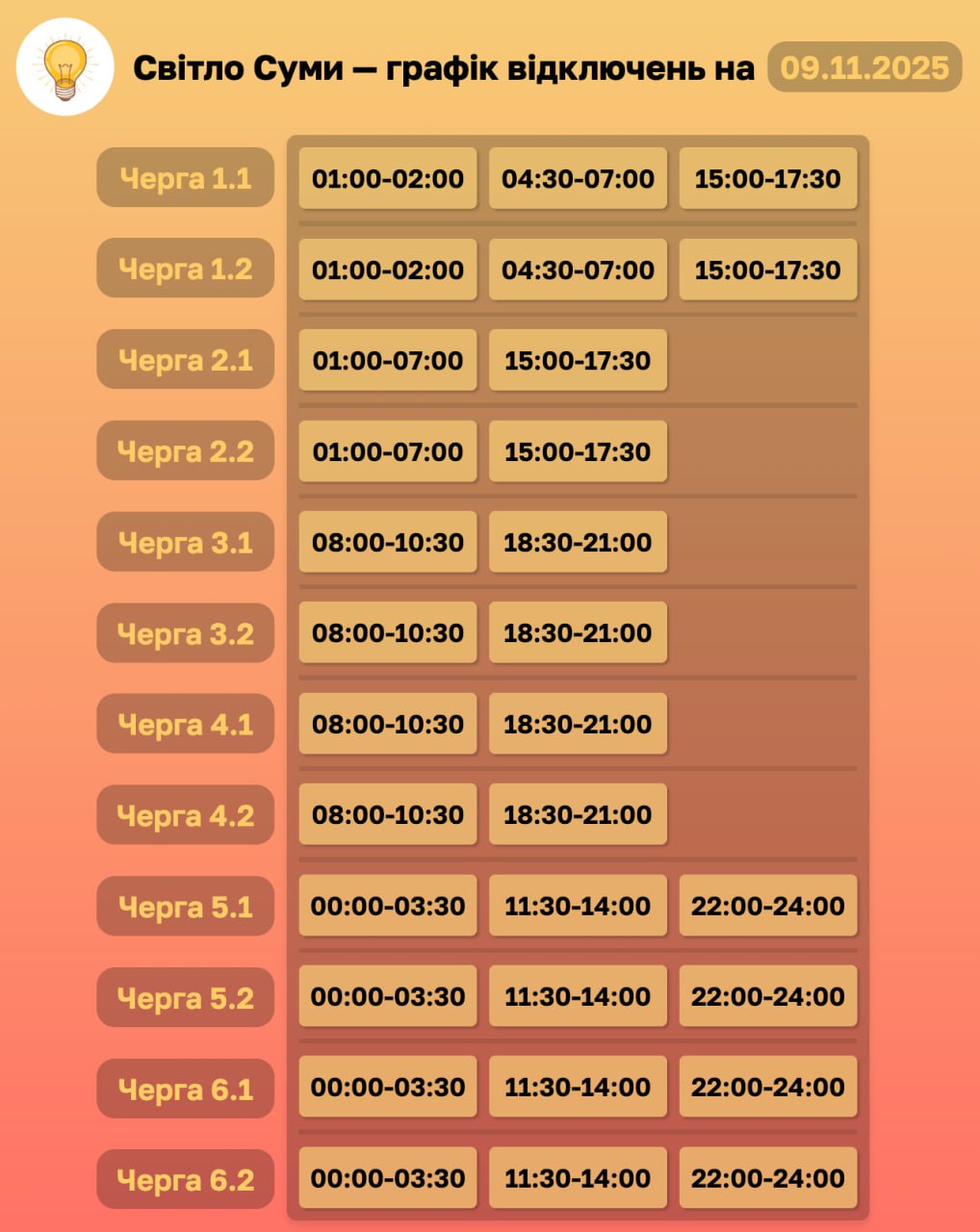 Оновлено графік відключень на сьогодні 8:33 / 09 листопада 2025 ЖКГ ⚡️Оновлено графік відключень електроенергії на 09.11.2025: + 30 хв на початку знеструмлення та наприкінці – на здійснення перемикань. Підписуйтесь на нас у ТЕЛЕГРАМ Підписуйтесь на нас в ІНСТАГРАМ Поділитися в соціальних мережах