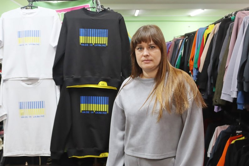 В сусідньому з магазином приміщенні розташована швейна майстерня. Тетяна Яценко каже, шиє на професійному рівні останні 30 років: “Для початку викроїть, нанести наліпку, далі збирається на оверлоку, потім штрих заключний — розпошивальна машина. Потім випрасували й виріб готовий”.