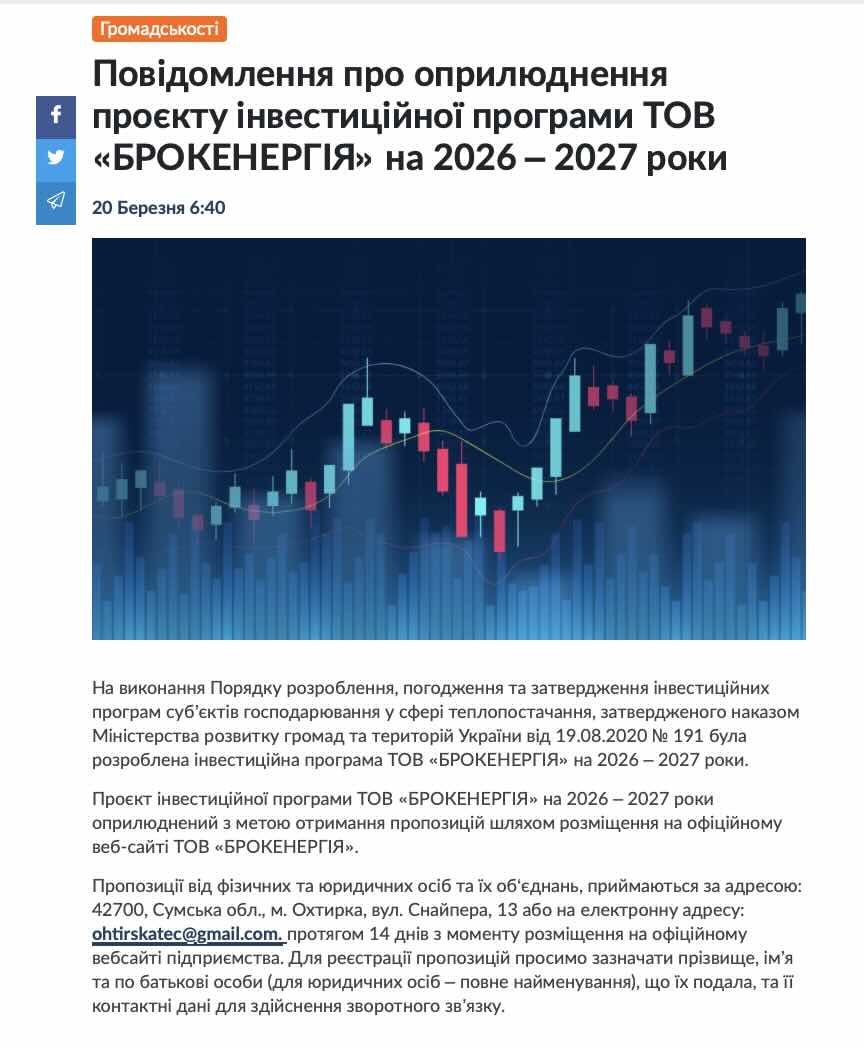 В Охтирці стартував небачений атракціон чиновницької відкритості та прозорості. Міська рада з пафосом опублікувала на своєму сайті офіційне повідомлення: громаду терміново кличуть обговорювати грандіозний проєкт інвестиційної програми ТОВ «БРОКЕНЕРГІЯ» на 2026–2027 роки. Здавалося б, ідеальна демократія — пишіть пропозиції, контролюйте монополіста, впливайте на життя міста!