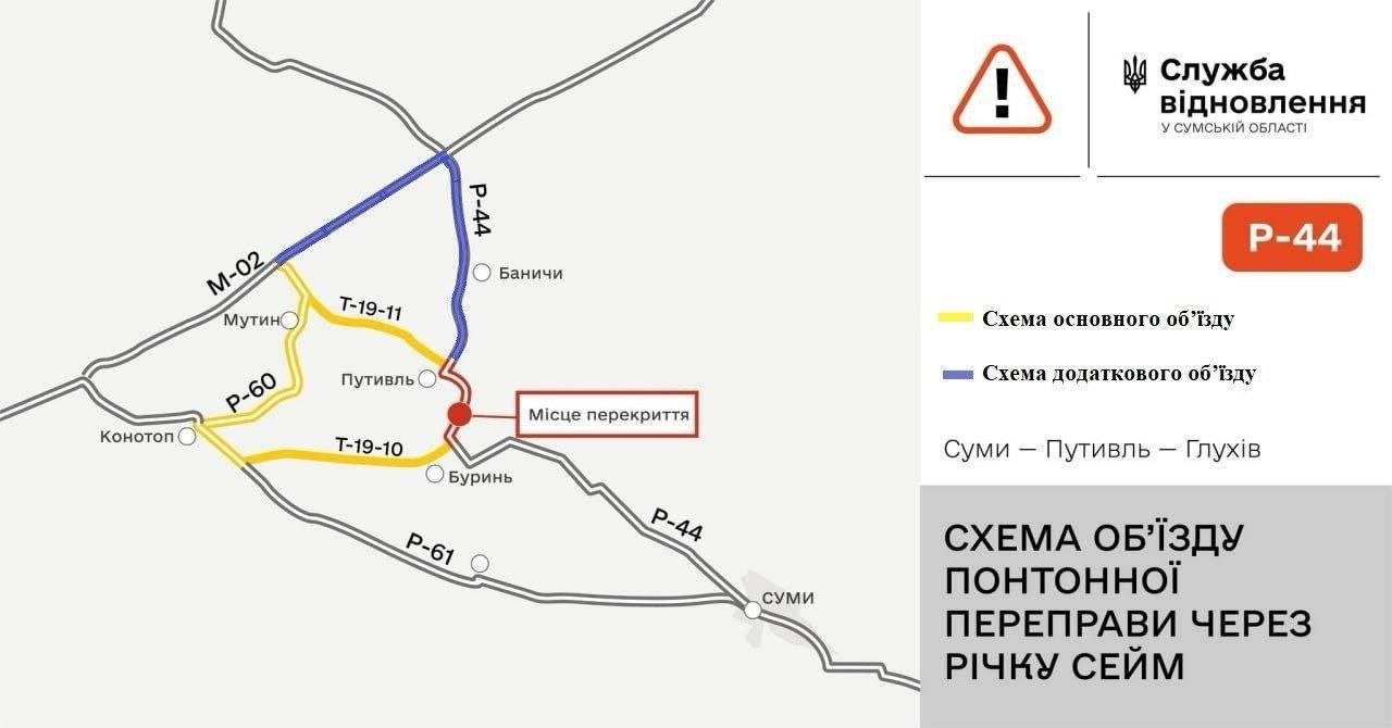 На Сумщині з 12:00 3 квітня 2026 року обмежено рух транспорту через понтонну переправу на автодорозі Р-44 Суми — Путивль — Глухів поблизу села Чумакове.