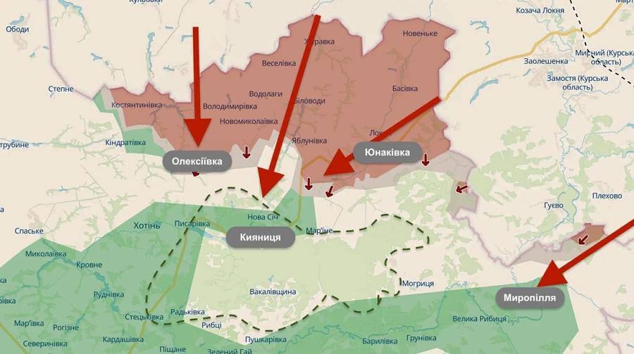 Наразі основним вектором тиску залишається вже захоплена ділянка Олексіївка — Яблунівка — Юнаківка. Звідси окупанти тягнуть свої щупальця одразу по трьох напрямках, націлюючись на села: