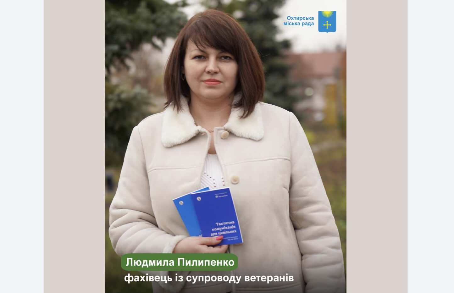 Охтирська міська рада щойно представила нам Людмилу Григорівну Пилипенко — «фахівця із супроводу ветеранів війни та демобілізованих осіб». Кабінет №16, режим роботи з 8:00 до 16:30, телефони, гарантії конфіденційності, індивідуальний підхід — усе як у кращих традиціях державного протоколу.
