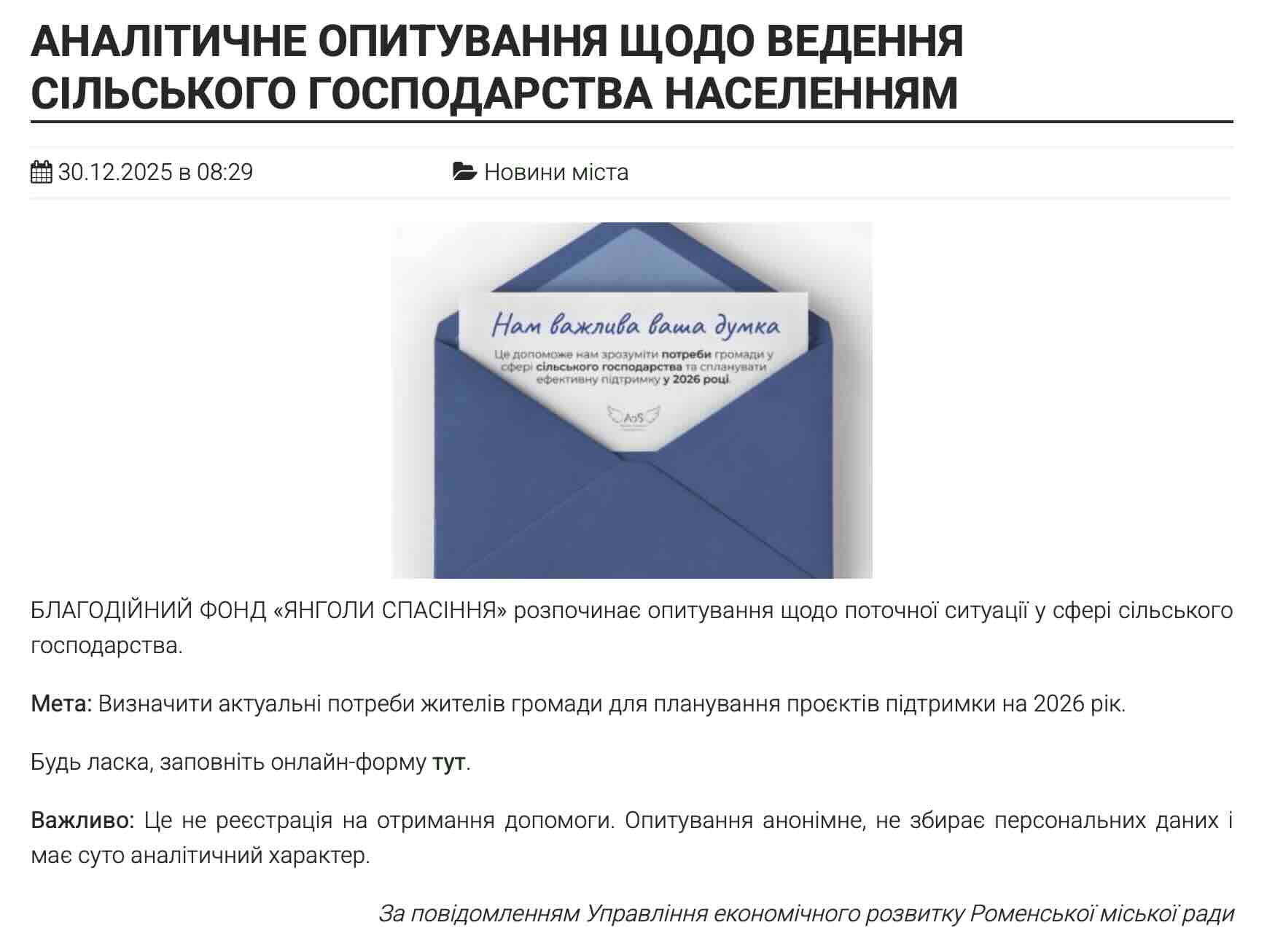 На сайті мерії з’явилося пафосне оголошення від БФ «Янголи Спасіння». Фонд оголосив про початок “аналітичного опитування” щодо ситуації в сільському господарстві.