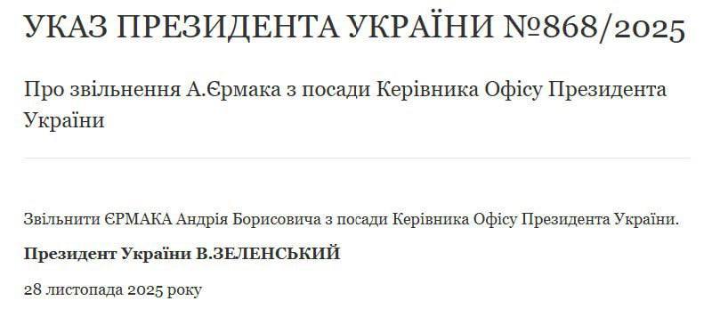 Увечері Володимир Зеленський офіційно підтвердив: керівник Офісу Президента Андрій Єрмак подає у відставку. Указ уже з’явився, тож кадрові зміни на Банковій — питання фактично вирішене.